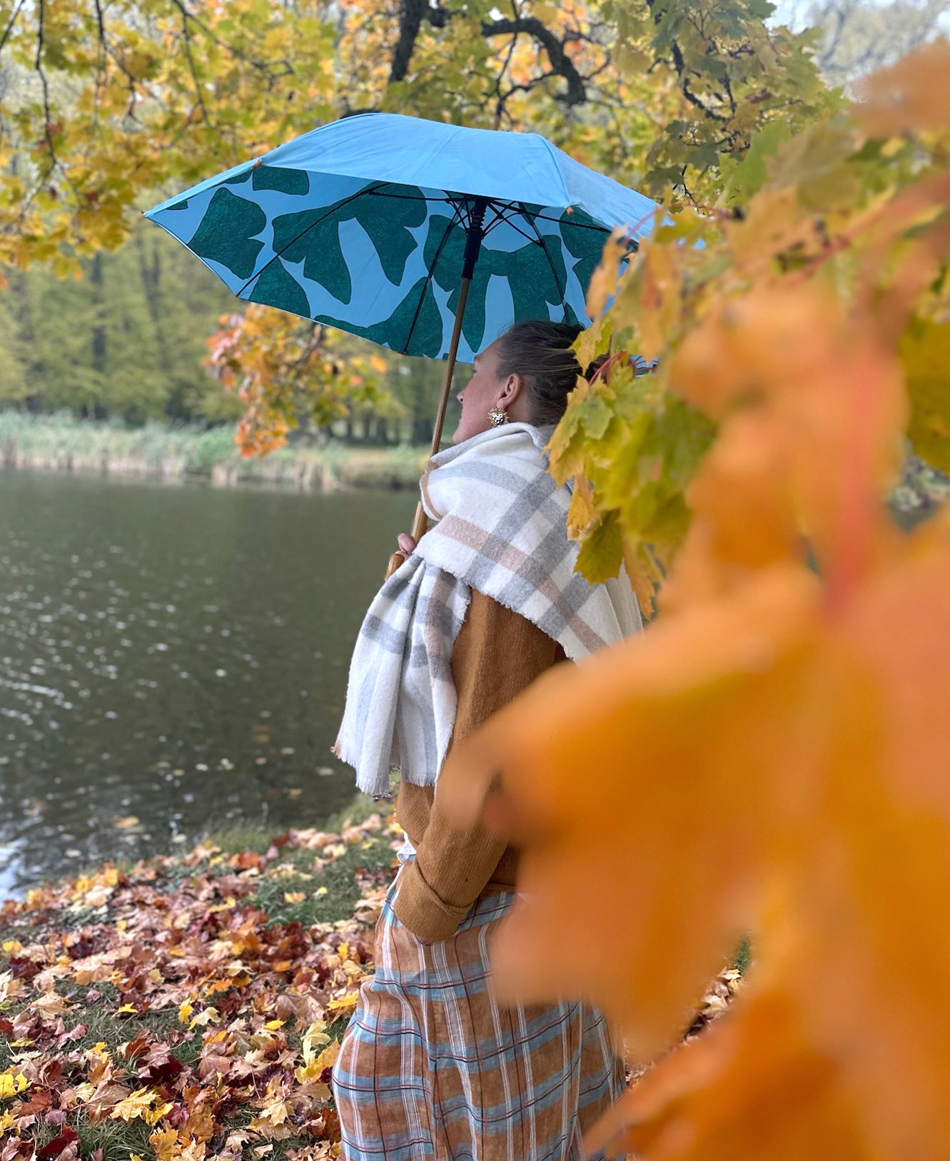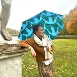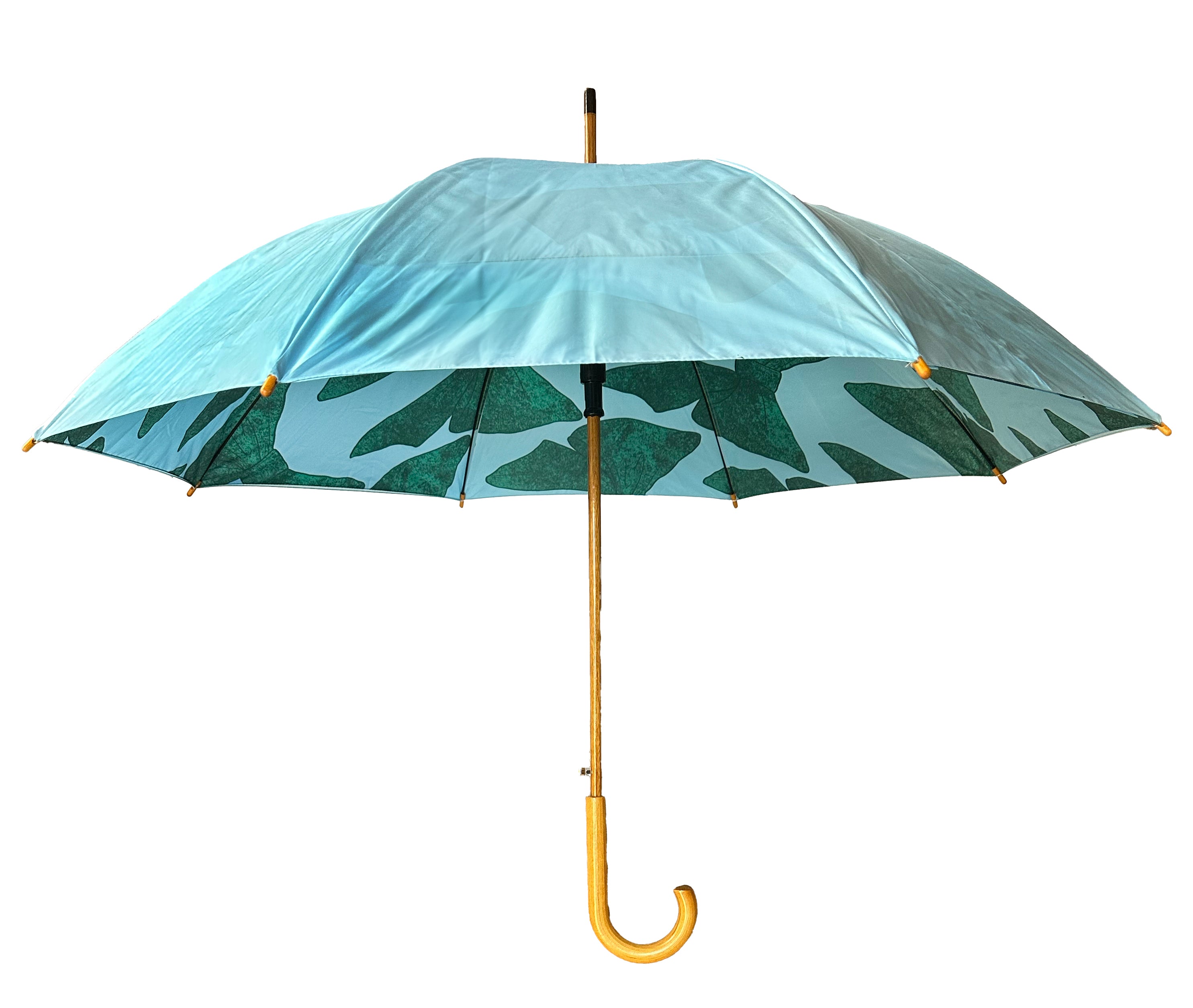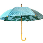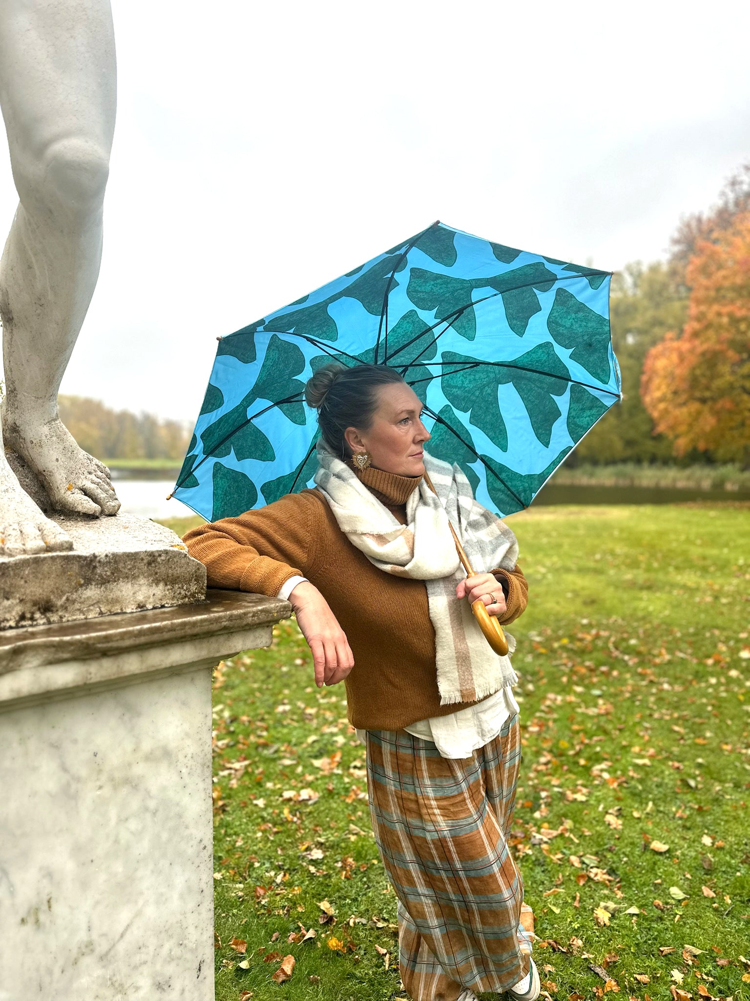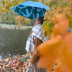 Klassiskt paraply med mönster på insidan och en vacker blå på utsidan.
